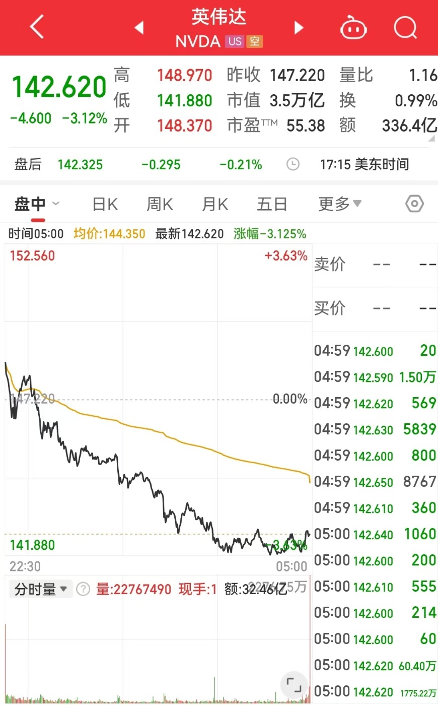 英伟达报142.62美元,跌3.12%,市值一夜蒸发1127亿美元(约合人民币8165亿元)。