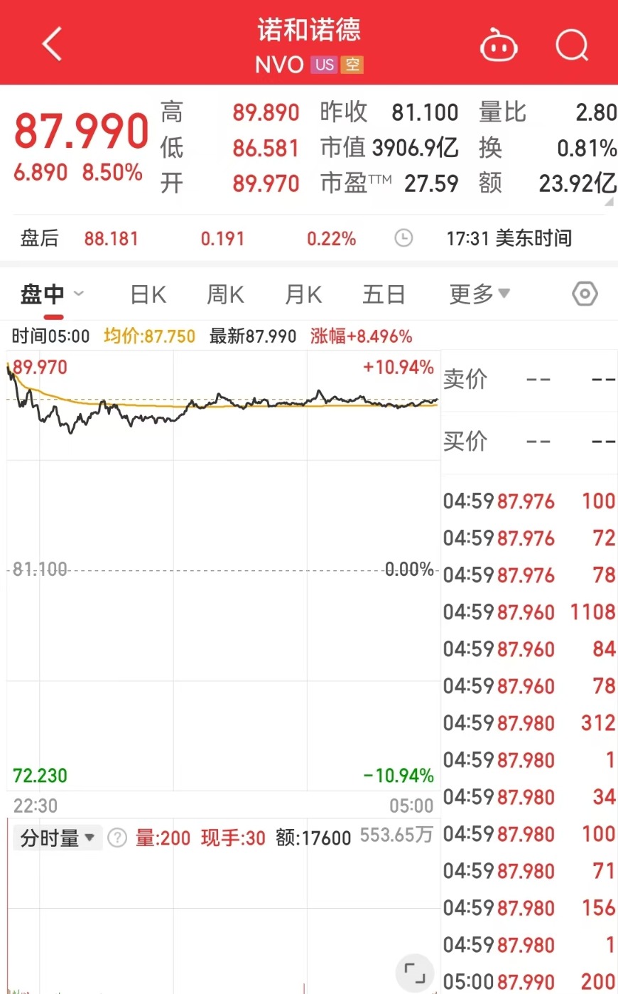 热门股方面,诺和诺德股价飙涨,盘初一度大涨超10%,截至收盘报87.99美元,涨幅8.5%,市值3906.9亿美元。